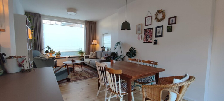 De woonkamer (40m2) is sfeervol ingericht met een groot raam aan de voorzijde en openslaande deuren naar de tuin.