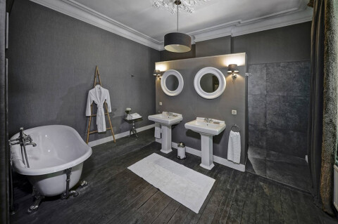 1e verdieping: slaapkamer 1, met authentiek balkon, dat uitzicht geeft op het stadspark, volledig ingerichte badkamer met inloopdouche, design toilet en luxe wastafels.