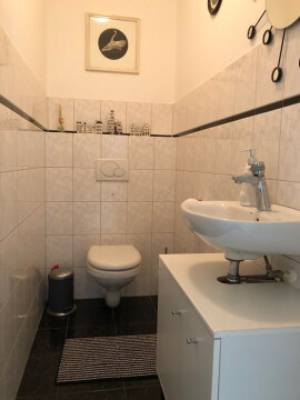 Entree/ruime hal met toiletruimte en meterkast. Toiletruimte v.v. zwevend closet met inbouwreservoir en fonteintje.